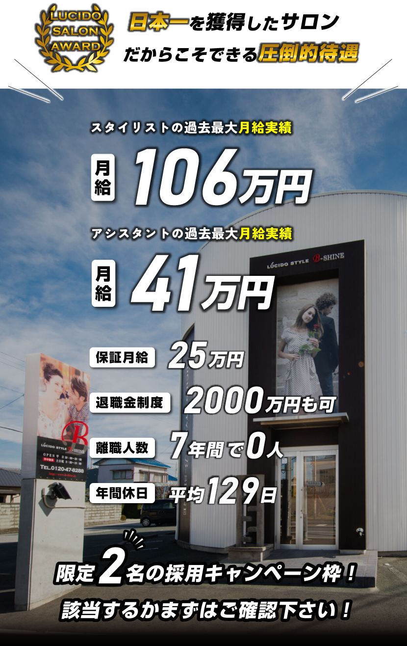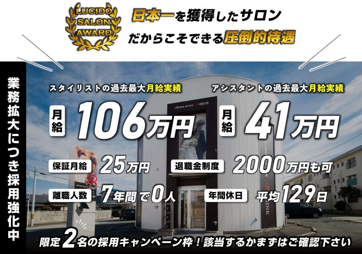 | 報酬(正社員) | ・スタイリスト:月給30万〜83.5万 ・店長:月給42万〜90万 ・マネージャー:月給50万〜100万 ※当店に就職した場合、今より報酬がアップするか、ぜひご確認ください。 → LINEで今より報酬がアップするか問い合わせる |